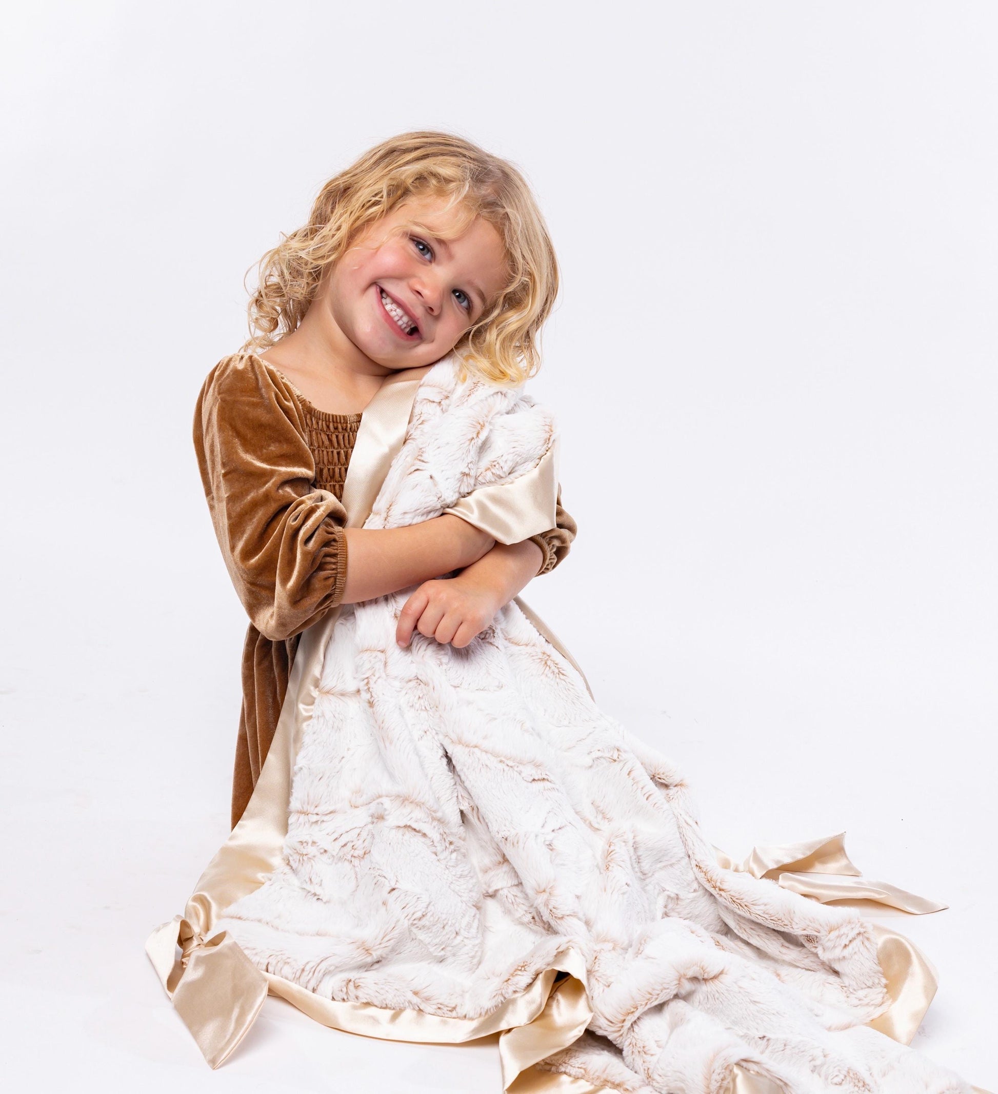 Faux fur is used on the front while our silky satin is used on the reverse making a lighter weight, more drapey blanket. Perfect for the babies who love satin! All four corners are finished with our signature knot. Luxuriously soft, these blankets make the perfect gift and are sure to be treasured!