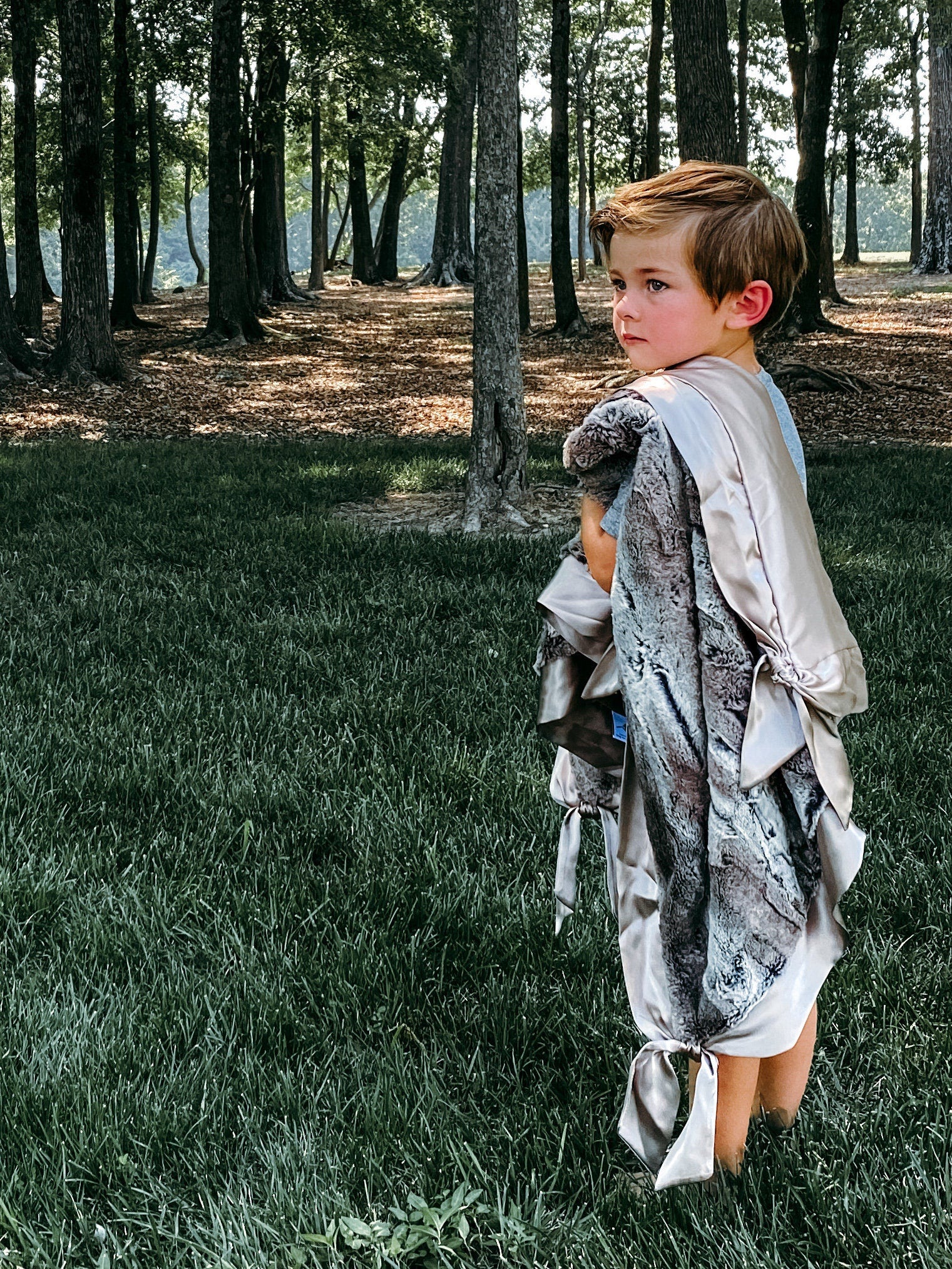 Faux fur is used on the front while our silky satin is used on the reverse making a lighter weight, more drapey blanket. Perfect for the babies who love satin! All four corners are finished with our signature knot. Luxuriously soft, these blankets make the perfect gift and are sure to be treasured!