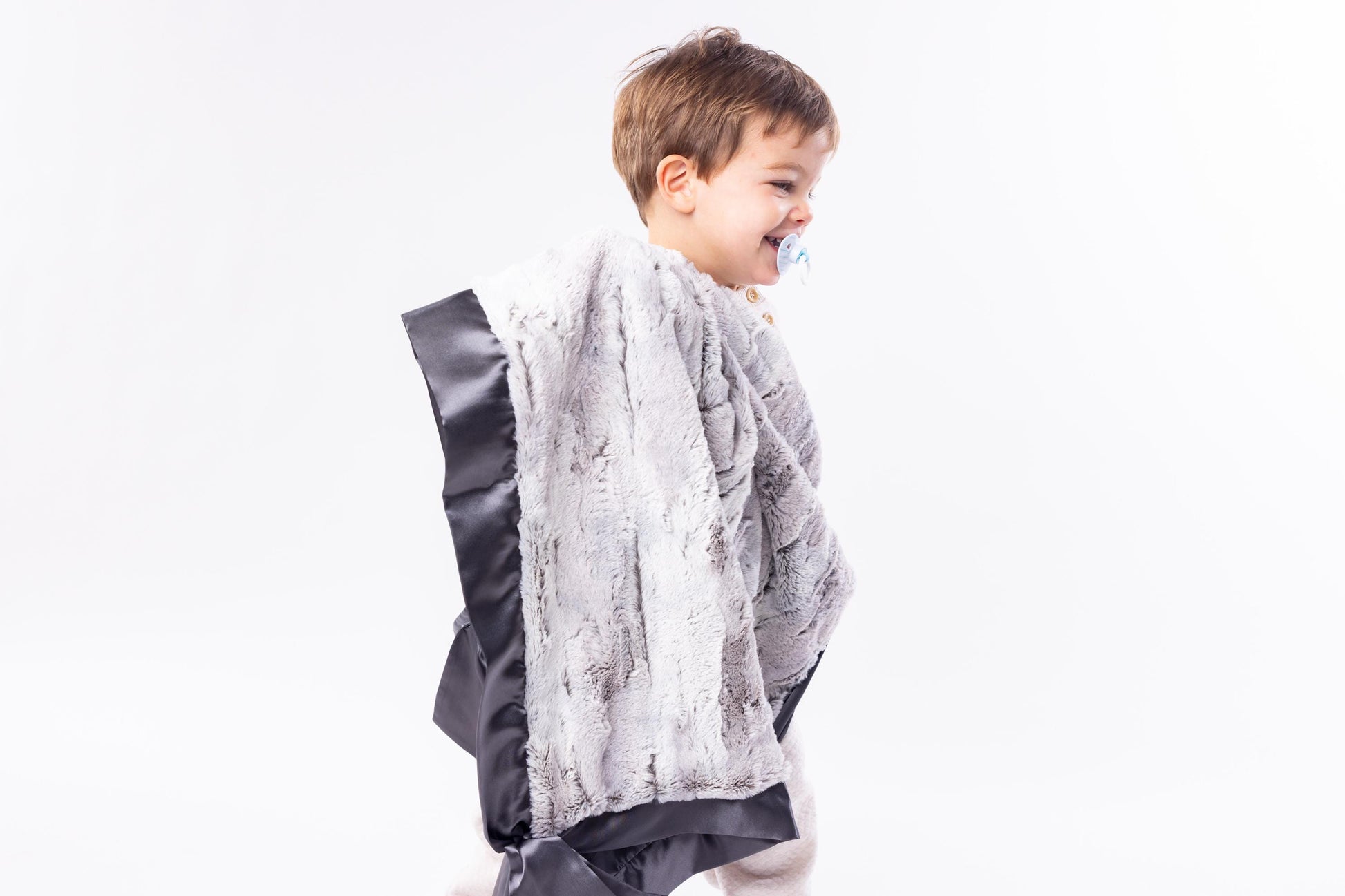 Faux fur is used on the front while our silky satin is used on the reverse making a lighter weight, more drapey blanket. Perfect for the babies who love satin! All four corners are finished with our signature knot. Luxuriously soft, these blankets make the perfect gift and are sure to be treasured!
